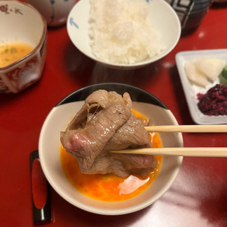 當壽喜燒的鍋子端上桌時,首先由女服務員為我們烹煮第一片牛肉。她熟練地將肉片放入鍋中,加上適量的糖和壽喜燒醬汁,肉質鮮嫩,醬汁的甜鹹味道令人驚豔。